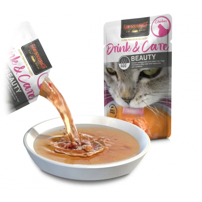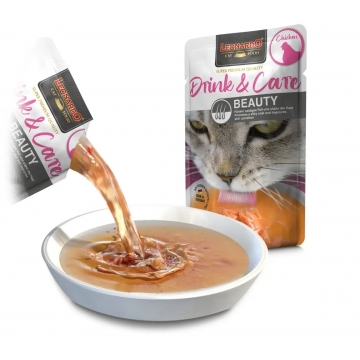 Kočka vám neřekne: „Cítím se dehydrovaná.“ Ale vy to poznáte – třeba když spí víc než obvykle. Drink & Care Beauty je lahodný kuřecí vývar s kousky masa a kapkou krillového oleje, který chutná a především perfektně hydratuje. Ideální jako doplněk ke granulím pro mlsné kočičí jazýčky.